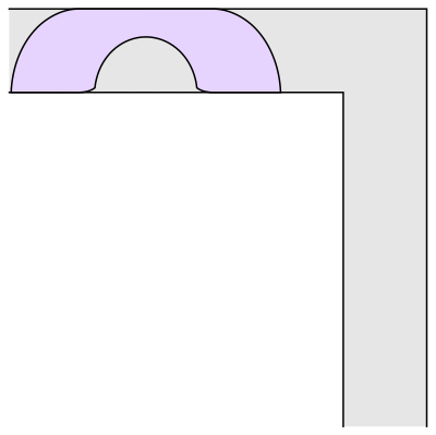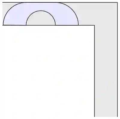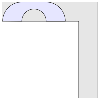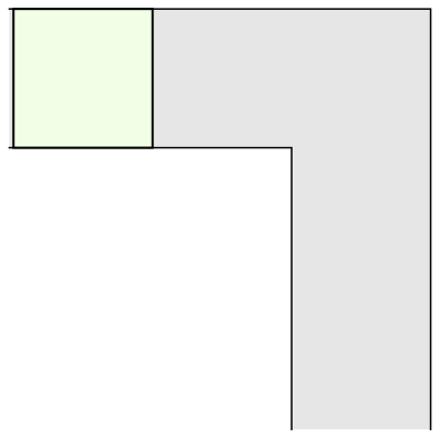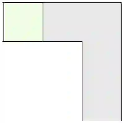 简单起见,先从「正方形」入手 [3]。就和光滑斜面上的滑块一样,沙发可以轻松地通过这个转角,其实这应该也是最容易想到的方案。可惜,现在这个形状的「沙发常数」只有 1。