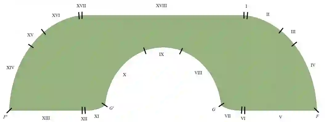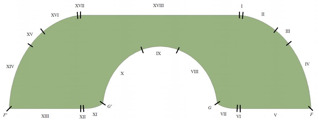 其中 V, XIII 和 XVIII 三段是线段, I, VI, XII, 和 XVII 是圆弧, II, III, VII, XI, XV 和 XVI 是圆的渐开线, IV 和 XIV 是圆的渐开线的渐开线。不过,他依旧没法证明得到的这个沙发曲线是最优的沙发曲线。