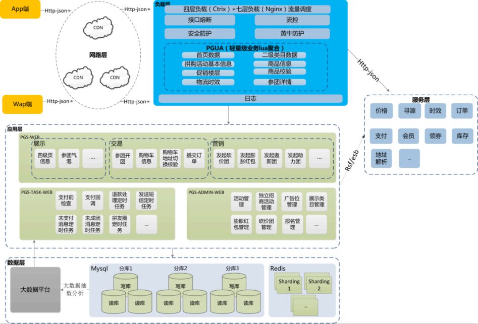 因此,系统优化所做的第一件事情就是对拼购系统架构进行了重构。一方面,进行横向切分,将系统分层,包括: