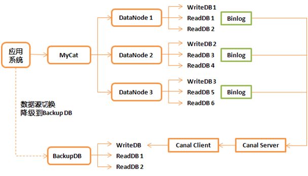 当 Mycat 出现问题时,我们可以通过应用层的数据源切换,降级为单库,保证业务。