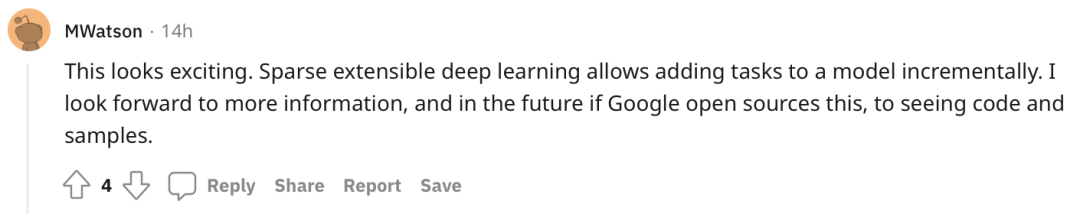 「看起来非常令人兴奋。稀疏可扩展的深度学习可以向一个模型中依次添加任务。我也非常期待之后谷歌的开源代码和样本。」