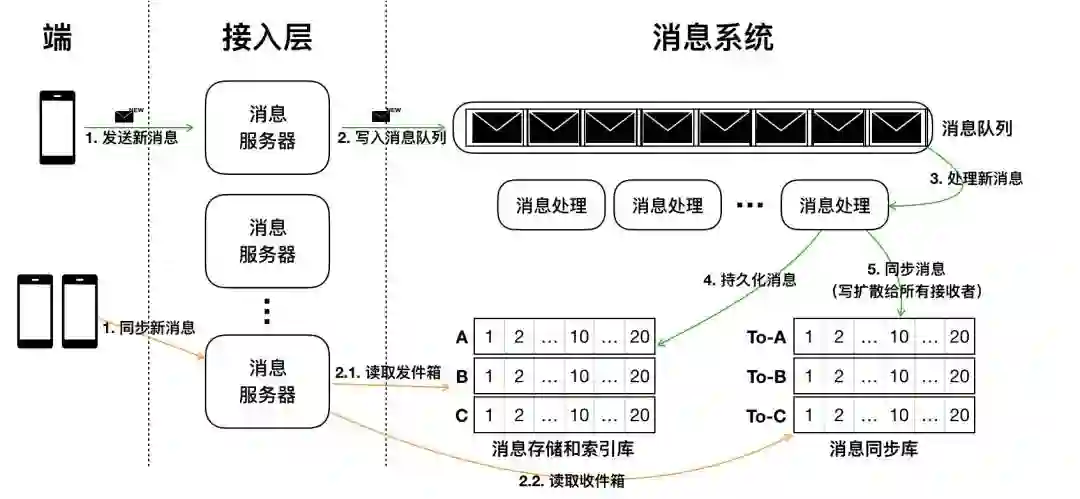 消息的同步:将消息完整的、快速的从发送方传递到接收方,就是消息的同步。消息同步系统最重要的衡量指标就是消息传递的实时性、完整性以及能支撑的消息规模。从功能上来说,一般至少要支持在线和离线推送,高级的IM系统还支持『多端同步』。