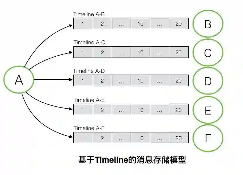 如图是基于Timeline的消息存储模型,消息存储要求每个会话都对应一个独立的Timeline。如图例子所示,A与B/C/D/E/F均发生了会话,每个会话对应一个独立的Timeline,每个Timeline内存有这个会话中的所有消息,消息根据会话顺序排序,服务端会对每个Timeline进行持久化存储,也就拥有了消息漫游的能力。