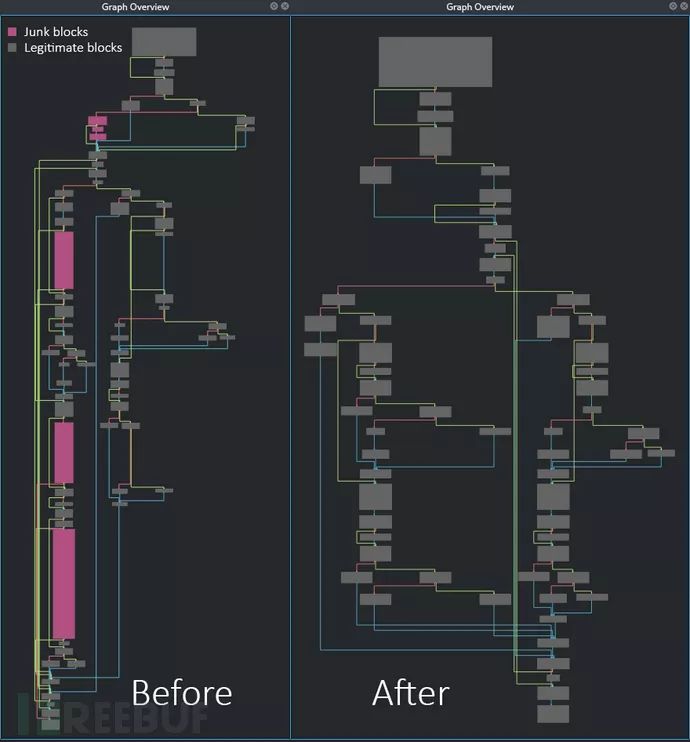 当满足这两个特征时,我们可以说第二个块很可能是垃圾代码块。这样,我们就可以将垃圾块从图表中删除了,并使用无条件跳转来修补源代码。