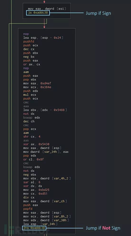 APT32在进行代码混淆处理时,大量使用了控制流混淆,并且向函数流中注入了大量垃圾代码块。这些垃圾代码块不会实现任何功能,只是为了混淆视听而已。