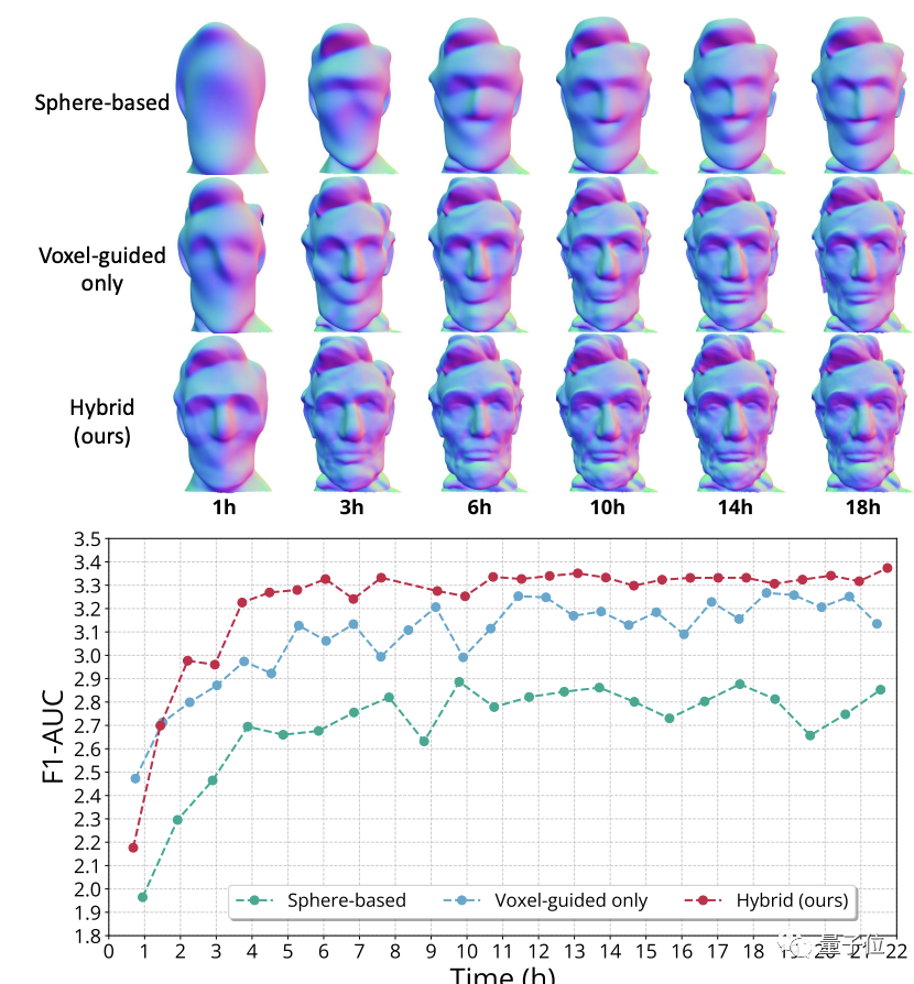 在消融实验中可以看到,仅使用体素引导方法收敛的比基于球体的方法快,但不如混合方法细节丰富。