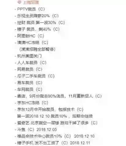 8月, 美团、拉钩曝出裁员信息;10月, 阿里、京东等企业不同程度“缩招”;12月,趣店斗鱼等掀起裁员高潮……