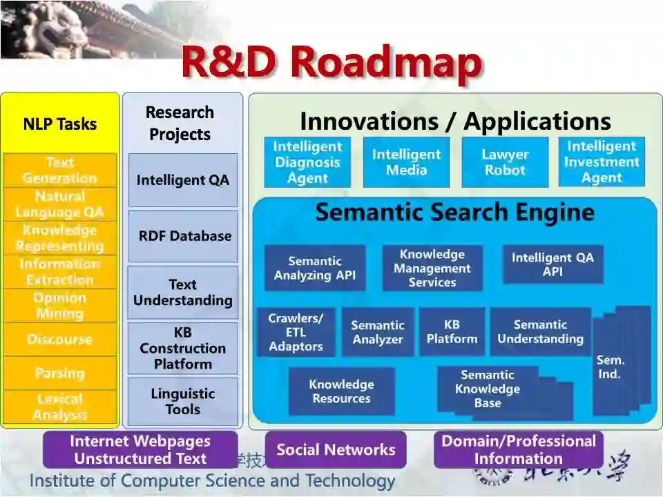 长期从事自然语言处理和大规模语义数据管理的前沿研究工作。近五年来牵头研制了具有自动扩展和质量控制功能的开放域语义知识库构建技术、基于知识库的语义理解与自然语言问答、语义搜索引擎等一系列自然语言理解与认知智能的前沿技术,并开展了面向智能知识服务的行业应用。采用上述技术构建的PKUBase是国内科研单位建设最早且规模最大的语义知识库之一。基于知识库的语义理解和自然语言问答系统在欧盟组织的国际权威评测QALD上连续三年取得了第一名的成绩,在美国NIST组织的TREC微博检索任务上连续两年取得第一名。