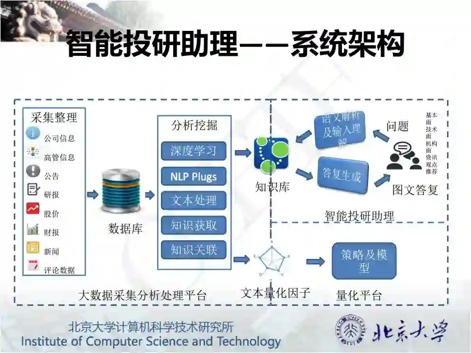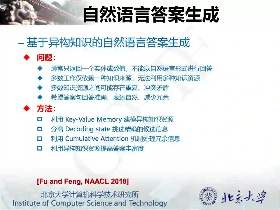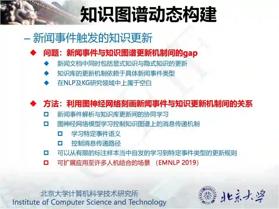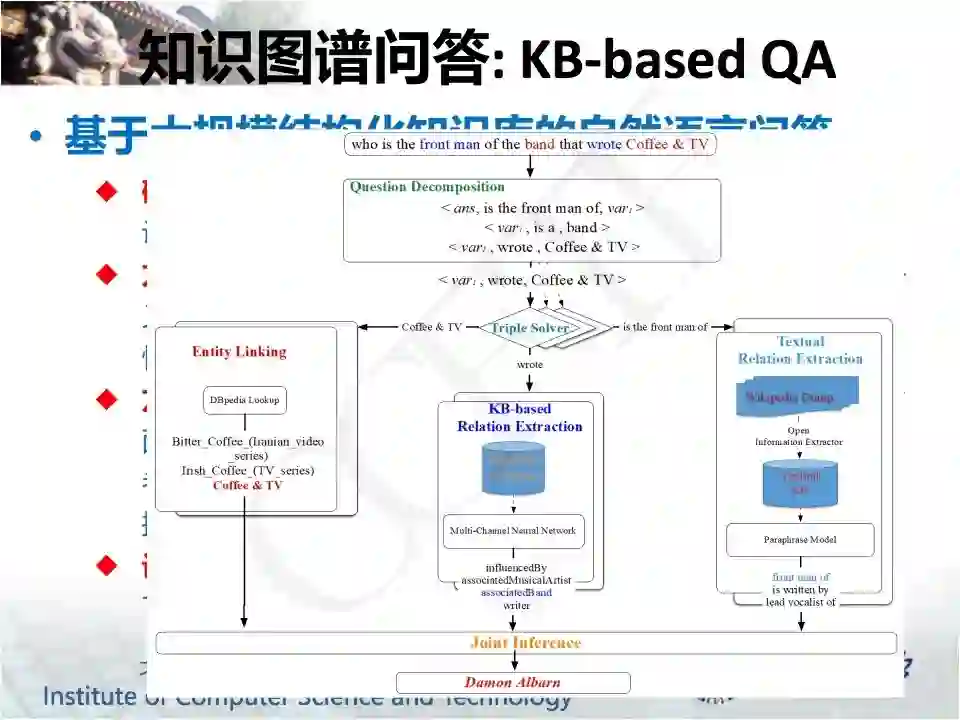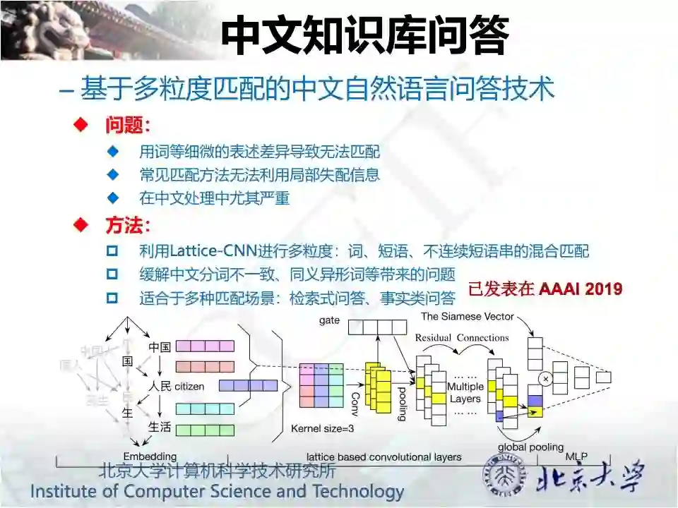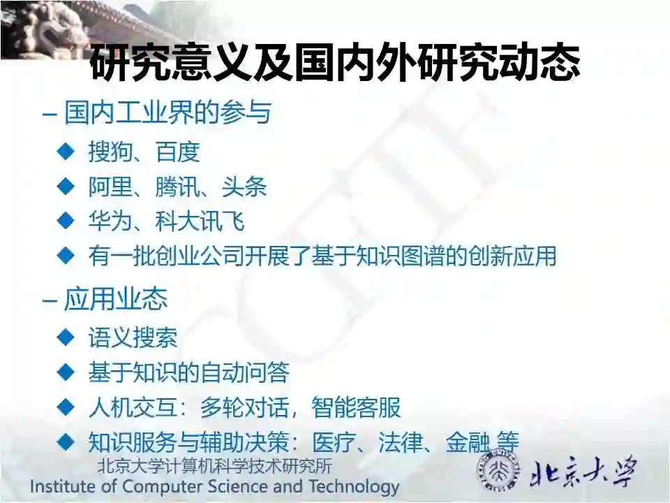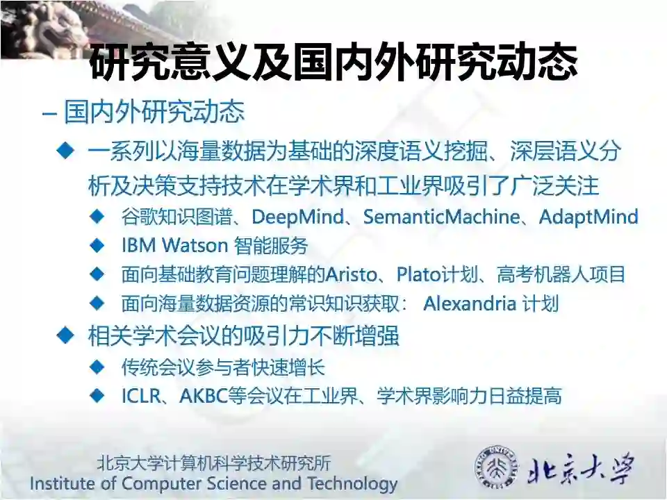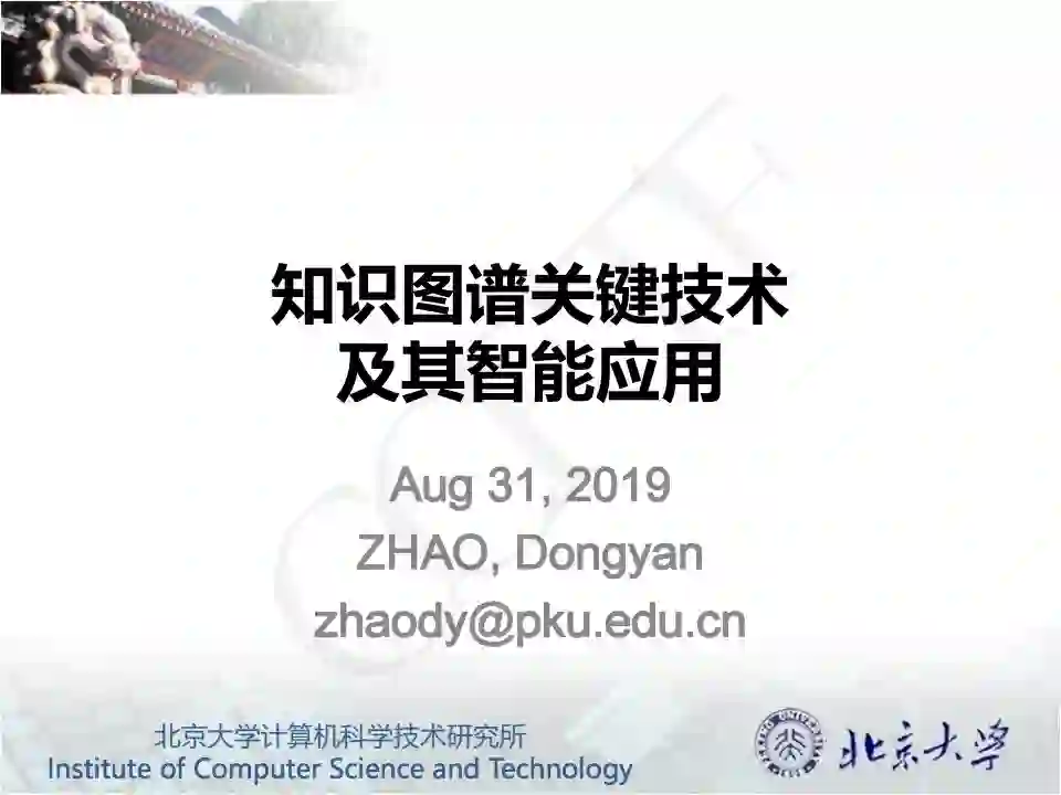随着自然语言处理等相关技术的发展,知识图谱已经成为工业界开展下一代人工智能应用的重要基础。几周前,北京大学的赵东岩老师,在计算所做了名为《知识图谱的关键技术及其智能应用》的讲座,讲座从知识图谱构建、补全及其人机交互问答等方面系统阐述知识图谱的关键技术方案;并结合北大计算机研究所在这个研究方向上的具体进展,以实际应用为背景、探讨如何基于知识图谱实现智能问答等智能应用的技术路线。