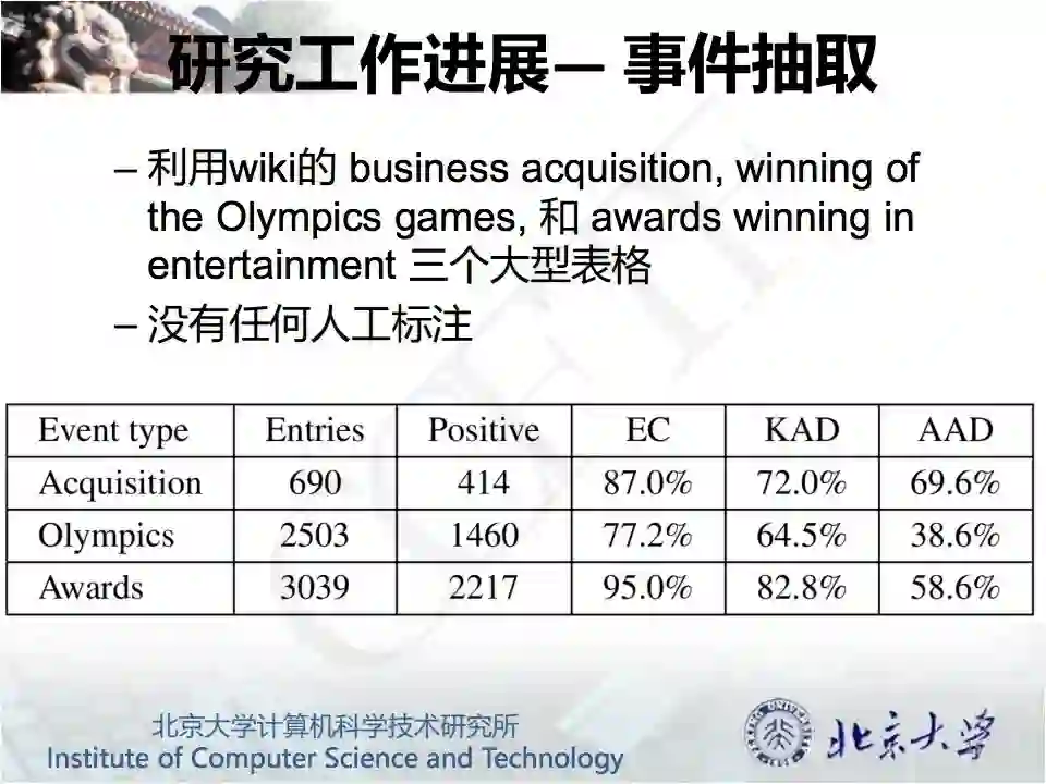 近年来承担国家自然科学基金、863、科技支撑计划等国家级项目15项、主持7项,省部级科研项目8项、主持4项,发表学术论文100余篇(包括ACL、AAAI、IJCAI、SIGKDD、SIGIR、SIGMOD、VLDB,AI Journal、TKDE、VLDB Journal等顶级会议和期刊40余篇),授权发明专利20项、申请10项,先后七次获得国家和省部级奖励,包括 2006年度国家科技进步二等奖(排名第一)。个人获第十届中国青年科技奖(2007年)和北京市第七届“科技之光”技术创新特别奖等荣誉。