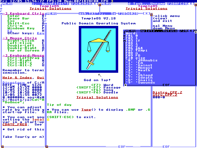 从屏幕上你可以看到这是一个 “公共领域(Public Domain)” 的操作系统,也就是说人人都可以随意使用和修改它。这个系统还有很不错的文档,你可以顺着帮助文档学会使用这个系统,还可以在系统里找到开发和调试的工具。根据屏幕提示,你可以使用 F6 键随机地调出《圣经》里的某个单词,或者使用 Shift+F6 调用出随机的《圣经》段落…… 你可以玩一个叫 AfterEgypt 的游戏,里边模拟的是圣经里摩西带领以色列人离开埃及以后的故事。这个系统的开发语言叫 HolyC,文件系统叫“红海”。所有的这一切,都呼应《圣经》的内容,也呼应着这个操作系统的名字——神殿系统。