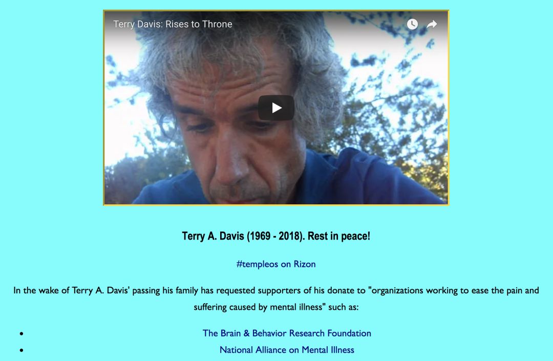 Terry Davis于11日在Youtube发布了最后一条视频,声称他当时位于Dalles的图书馆附近。而据Dalles警察局消息,当日晚上9点左右,一名不知身份的40多岁男子在第一和终点站街道被火车撞死。并不排除自杀的可能。
