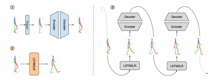 在长时间尺度上预测人的运动在各个应用领域仍然是一个很具挑战性的问题。在这个报告中,作者介绍了他们提出一个预测时空运动模型的新架构:Dropout Autoencoder LSTM (DAE-LSTM) ,这个架构能够在长时间尺度上合成较为自然的运动序列,而不会出现灾难性的漂移或退化。据作者介绍,这个模型由两部分组成:一个三层循环神经网络(用于模拟临时方面)和一个新型的自动编码器(通过随机删除训练中关节的信息,对人体骨骼的空间结构进行隐性恢复)。此外作者还提出一种新的评估方案,使用动作分类器来评估合成运动序列的质量。通过报告中的展示,可以看出这项研究相比之前的方法有更好的表现。