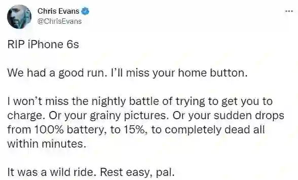 今天,美国队长的扮演者克里斯·埃文斯(Chris Evans)发了一条有趣的推文。换上新手机的他悼念了一番 iPhone 6s 和它的 Home 键。