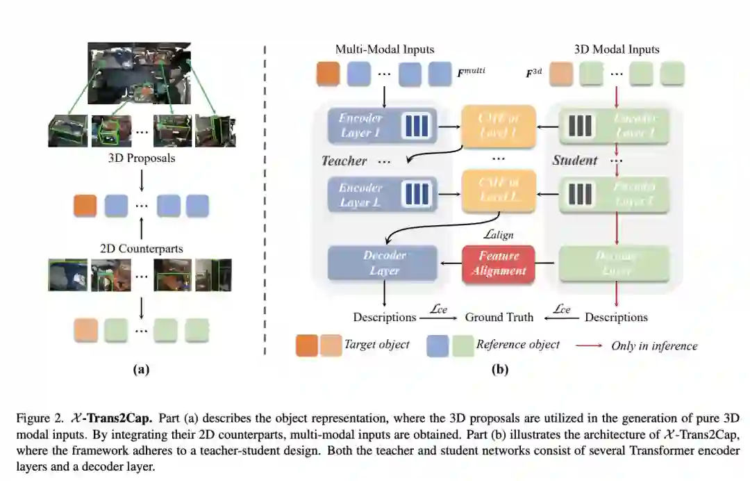 本文研究了使用 Transformer 进行 3D 密集字幕的跨模式知识转移,即 X -Trans2Cap。本文提出的 X -Trans2Cap 通过师生框架支持的知识蒸馏有效地提高了单模态 3D 字幕的性能。在实践中,在训练阶段,教师网络利用辅助的 2D 模态,通过特征一致性约束引导仅以点云作为输入的学生网络。由于精心设计的跨模态特征融合模块和训练阶段的特征对齐,X-Trans2Cap 轻松获取嵌入在 2D 图像中的丰富外观信息。因此,在推理过程中只能使用点云来生成更忠实的字幕。