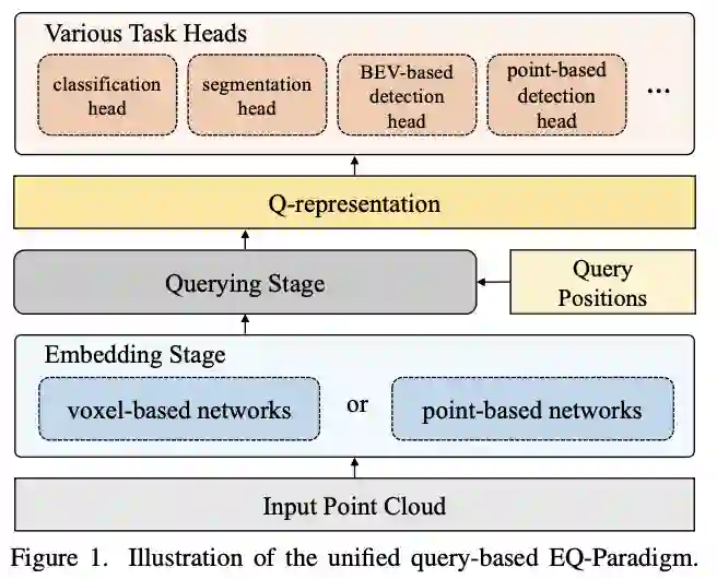 本文提出了一种新颖的嵌入查询范式 (EQ-Paradigm),用于 3D 理解任务,包括检测、分割和分类。EQ-Paradigm 是一个统一的范式,可以将任何现有的 3D 主干架构与不同的任务头结合起来。在 EQ-Paradigm 下,输入首先在嵌入阶段以任意特征提取架构进行编码,该架构独立于任务和头。然后,查询阶段使编码的特征适用于不同的任务头。这是通过在查询阶段引入中间表示(即 Q 表示)作为嵌入阶段和任务头之间的桥梁来实现的。本文设计了一个新颖的 Q-Net 作为查询阶段网络。各种 3D 任务的广泛实验结果表明,EQ-Paradigm 与 Q-Net 结合是一种通用且有效的管道,它可以实现骨干网和头部的灵活协作,并进一步提高最先进方法的性能.