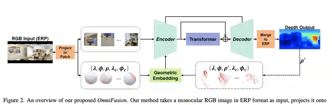 将深度学习方法应用于全向图像的一个最大的挑战是球面失真。在需要结构细节的深度估计等密集回归任务中,在扭曲的 360 度图像上使用普通 CNN 层会导致不希望的信息丢失。本文提出了一个 360 度单目深度估计管道OmniFusion,以解决球面失真问题。本文的管道将 360 度图像转换为失真较小的透视图块(即切线图像),以通过 CNN 获得块状预测,然后将块状结果合并为最终输出。为了处理补丁预测之间的差异,这是影响合并质量的主要问题,本文提出了一个具有以下关键组件的新框架。