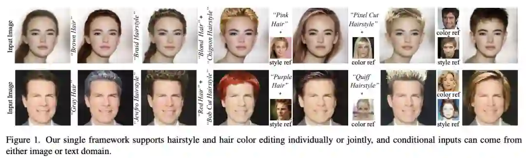 头发编辑是计算机视觉和图形学中一个有趣且具有挑战性的问题。许多现有方法需要精心绘制的草图或蒙版作为编辑的条件输入,但是这些交互既不简单也不高效。本文提出了一种新的头发编辑交互模式,可以根据用户提供的文本或参考图像单独或联合操作头发属性。为此,本文在共享嵌入空间中对图像和文本条件进行编码,并通过利用对比语言-图像预训练(CLIP)模型强大的图像文本表示能力提出统一的头发编辑框架。通过精心设计的网络结构和损失函数,本文的框架可以以一种解开的方式执行高质量的头发编辑。