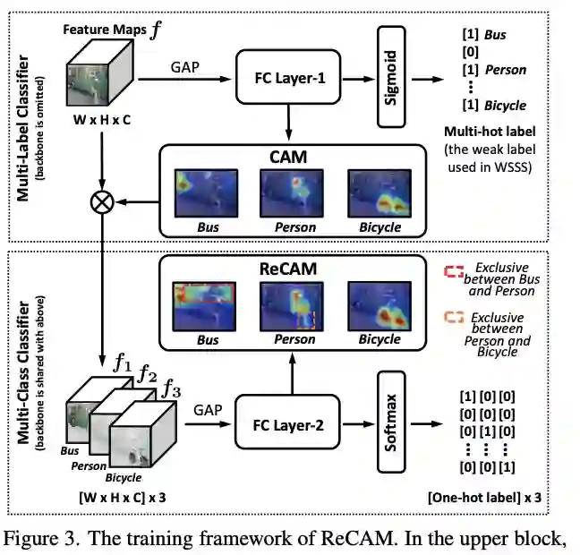 本文介绍了一种非常简单高效的方法:使用名为 ReCAM 的 softmax 交叉熵损失 (SCE) 重新激活具有 BCE 的收敛 CAM。给定一张图像,本文使用 CAM 提取每个类的特征像素,并使用它们与类标签一起使用 SCE 学习另一个全连接层(在主干之后)。收敛后,本文以与 CAM 中相同的方式提取 ReCAM。由于 SCE 的对比性质,像素响应被分解为不同的类别,因此预期的掩码模糊性会更小。对 PASCAL VOC 和 MS COCO 的评估表明,ReCAM 不仅可以生成高质量的遮罩,还可以在任何 CAM 变体中以很少的开销支持即插即用。