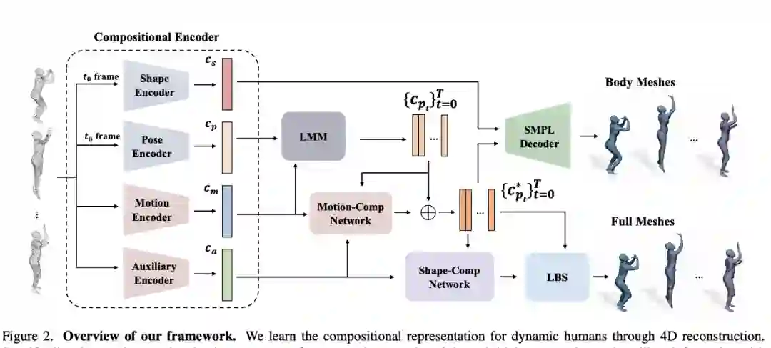 尽管基于深度学习的 3D 重建取得了令人印象深刻的成果,但对直接学习以详细几何对 4D 人体捕捉进行建模的技术的研究较少。这项工作提出了一个新颖的框架,可以通过从广泛使用的 SMPL 参数模型中利用人体先验来有效地学习动态人体的紧凑和组合表示。本文提出了一种简单而有效的线性运动模型来提供粗略和正则化的运动估计,然后使用辅助代码中编码的残差对位姿和几何细节进行每帧补偿。从技术上讲,本文引入了新的基于 GRU 的架构来促进学习和提高表示能力。