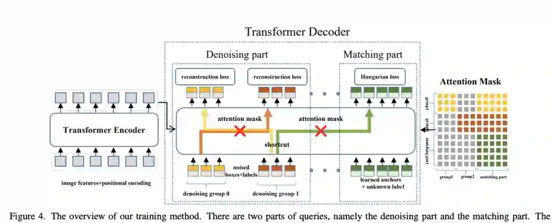本文提出了一种新的去噪训练方法来加速DETR训练,并加深了对 DETR 类方法的缓慢收敛问题的理解。本文表明,缓慢收敛是由于二部图匹配的不稳定性导致早期训练阶段的优化目标不一致。为了解决这个问题,除了Hungarian损失之外,本文的方法还向Transformer解码器中添加了带有噪声的ground-truth边界框,并训练模型重建原始框,这有效地降低了二分图匹配难度并导致更快的收敛。该方法是通用的,可以通过添加数十行代码轻松插入任何类似 DETR 的方法中,以实现显着的改进。