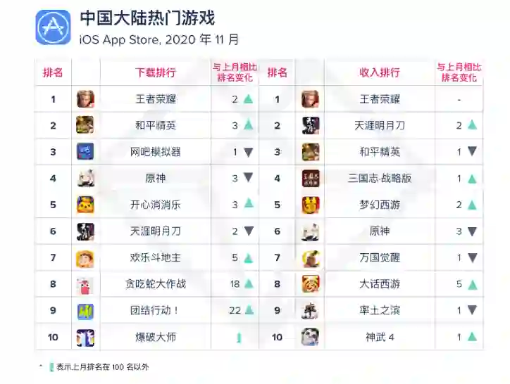据 App Annie 数据显示,11 月中国大陆热门游戏收入榜单中,腾讯包揽前三,上线一个月古龙 IP 加持的《天涯明月刀》收入首次超过《和平精英》,占收入排行榜第 2 名。网易《大话西游》重新回到收入排行榜前十的位置,上榜的还有该公司的游戏《梦幻西游》。全球游戏收入榜单较上个月相比并无明显变化,刚刚获得 App Store 以及 Google Play 双榜年度最佳游戏的《原神》,在收入排行榜第一。