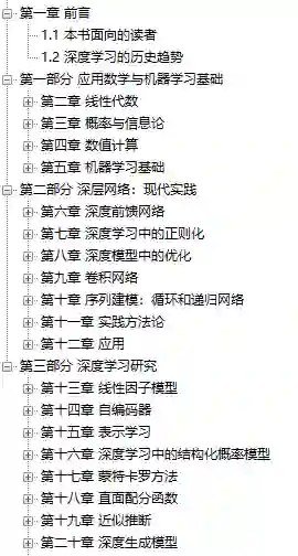 深度学习前沿:有一些前沿研究领域的介绍,如线性因子模型,表征学习,生成模型等。 可以按照自己的需要选读相关章节。