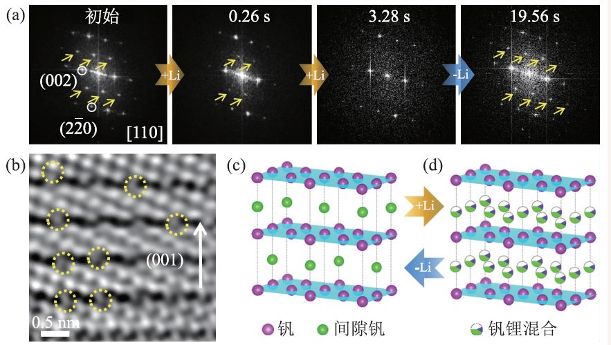图4 Li 离子在1T-V1+xSe2中迁移及层间V原子与Li 离子的相互作用[33] (a)锂离子在V5Se8(x=0.25)中的嵌入和拔出过程的高分辨TEM对应的FFT 花样;(b)V5Se8(x=0.25)的原子分辨像,黄色虚线圈表示层间自掺杂的钒;(c,d)V5Se8(x=0.25)嵌入Li离子前后的钒原子三维示意图