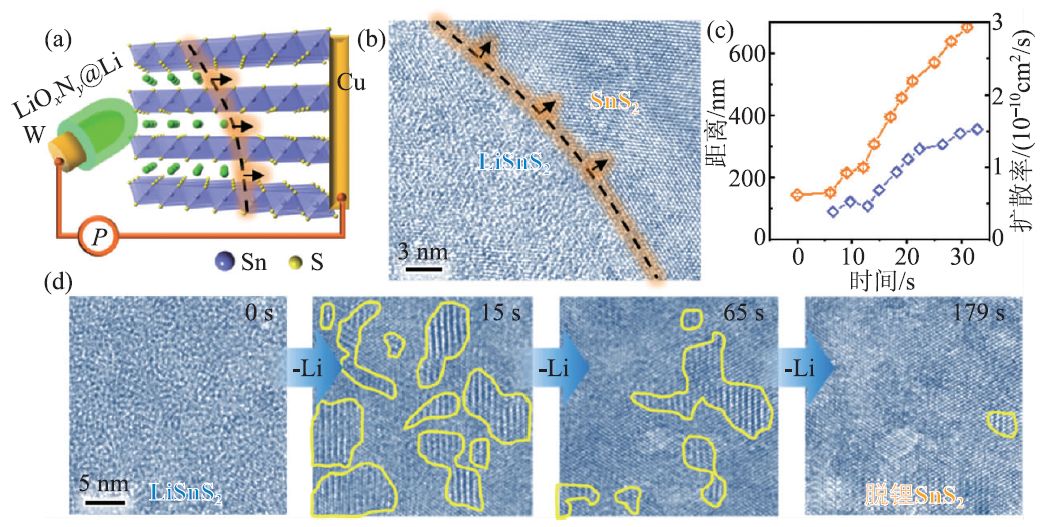 图3 Li 离子在SnS2中的迁移[17] (a)原位锂化实验示意图;(b)LiSnS2/SnS2相界的高分辨TEM图;(c)LiSnS2/SnS2相界扩散距离及对应的Li 离子的扩散率;(d)高分辨TEM图显示脱锂过程有中间相的生成