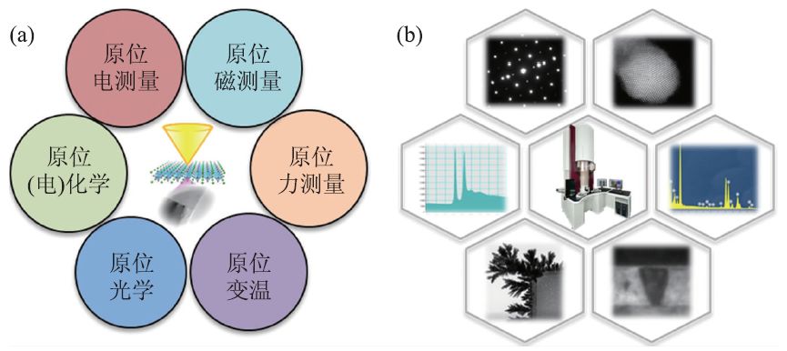 图2 原位研究方法示意图(a)原位TEM中可以施加的不同外场;(b)TEM 不同的成像及谱学功能:衍射、形貌、衍衬像、原子像、能谱、能量损失谱等
