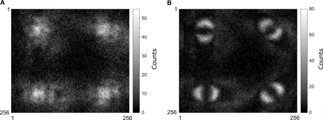 图(B)为光子在4种不同的相位下,被相机捕捉到的图像。