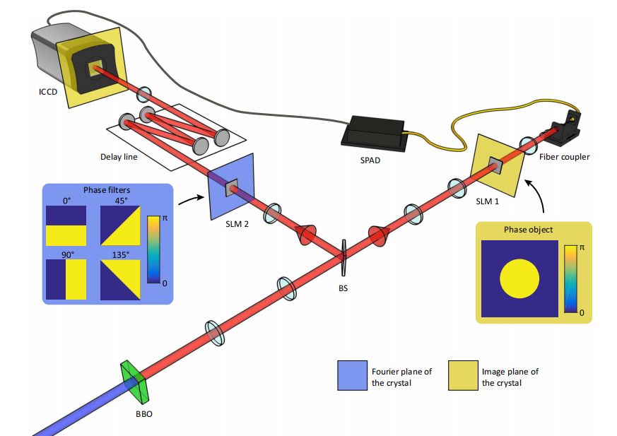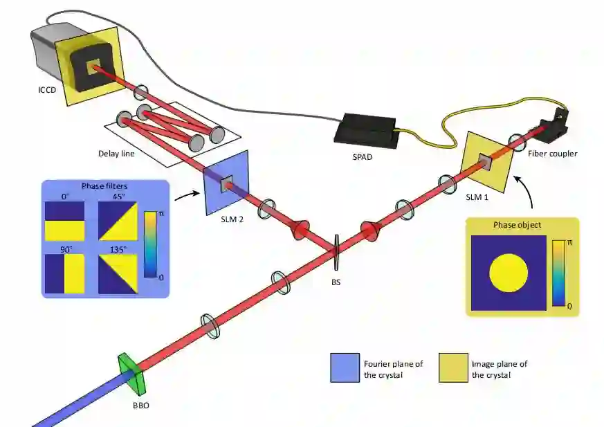 具体来说,一对光子被分束器(上图中的BS)分离,分别沿着两条路线传播。其中,第一个光子经过空间光调制器(SLM 1),被光纤收集后,继而被单光子探测器(SPAD)探测到。另一个光子经过分束器折射后,沿着另一条光路传播,通过了放置在BBO晶体的傅里叶平面的SLM 2。然后,这个光子会通过一段20米长的延迟线(Delay line),最终被增强型电荷耦合检测器(ICCD)相机检测到。