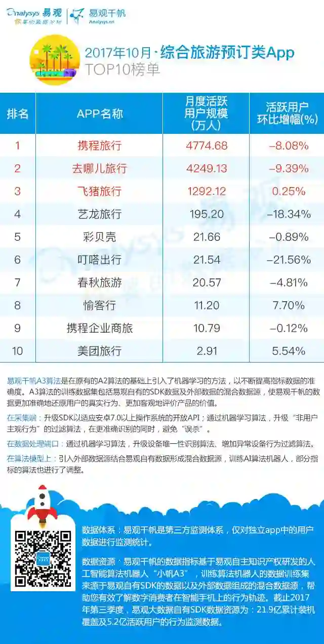 根据易观10月综合旅游类App的TOP10显示,虽然经历国庆假期短暂的高峰,旅游领域也呈现回落趋势,其中携程旅行、去哪儿旅行分别跌幅达到8.08%和9.39%,艺龙旅行则跌幅达到18.34%。