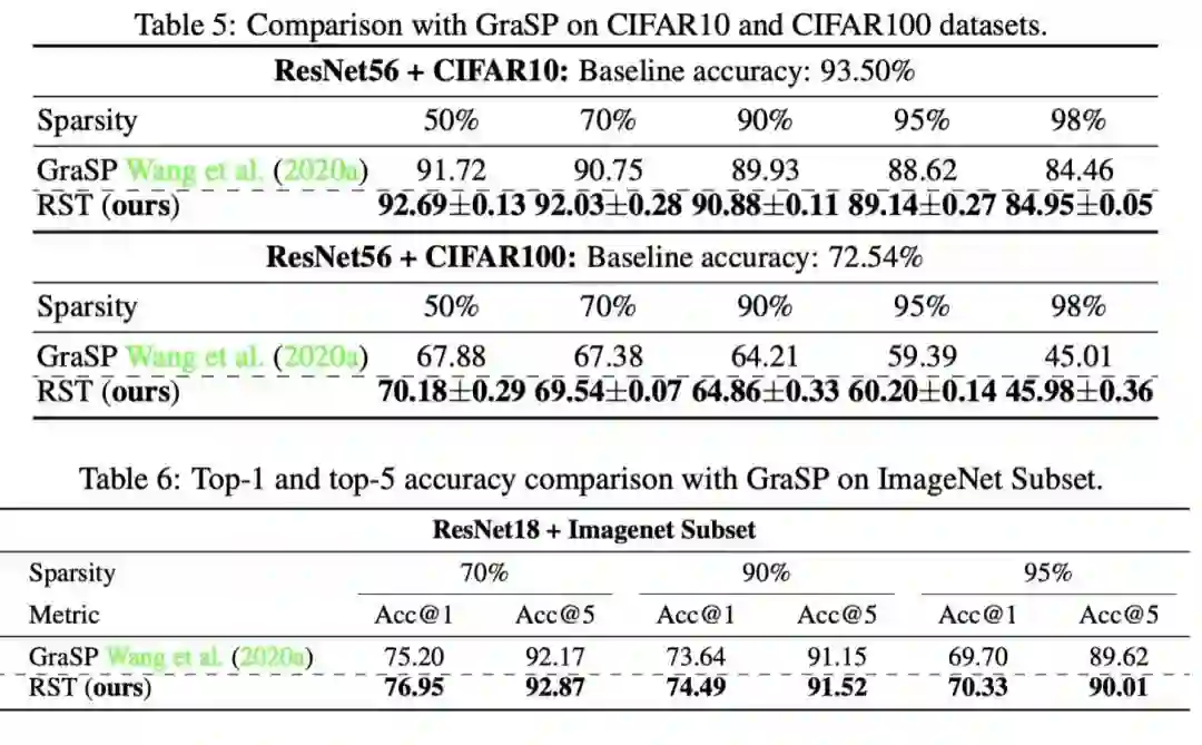 实验结果表明相比较于GraSP,RST方法普遍取得了更好的效果。
