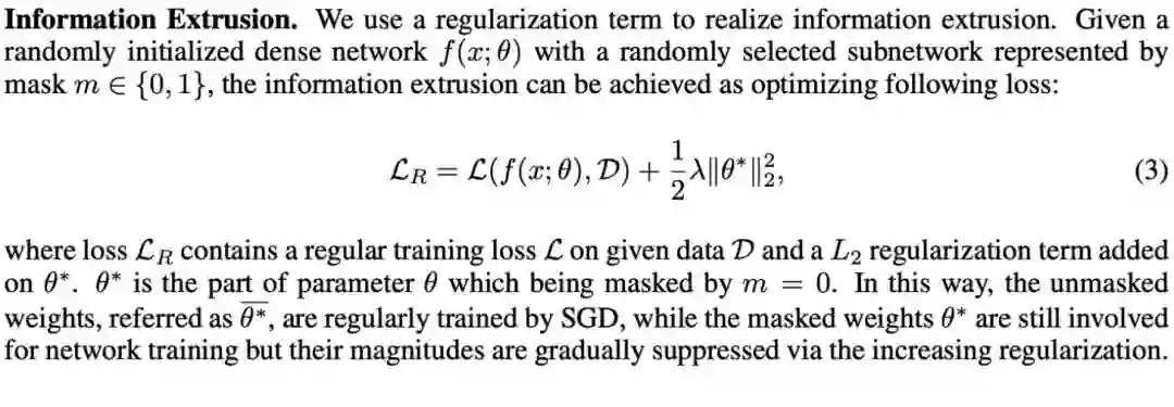 给定随机初始化网络并确定随机子网络结构,RST借助网络中其余的权重(masked weights)来帮助被选中的子网络(randomly selected sparse network)进行变换。形象的说,RST通过借助彩票池中所有的信息把一张随机彩票转换成了中奖彩票。RST通过训练完整的网络来完成。在训练过程中,RST通过在未被选中的权重上添加一个逐渐增加的正则项,从而这部分权重的幅值逐渐变小,这部分权重的作用也逐渐被抑制,并在变换结束之后完全去掉这部分权重。而被选中的子网络则进行正常训练。最终得到被转换好的稀疏子网络。这一过程可以理解为RST把信息从网络的其他部分挤到目标子网络中(information extrusion),如下图所示: