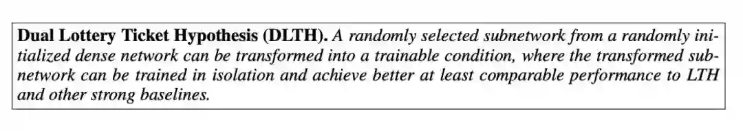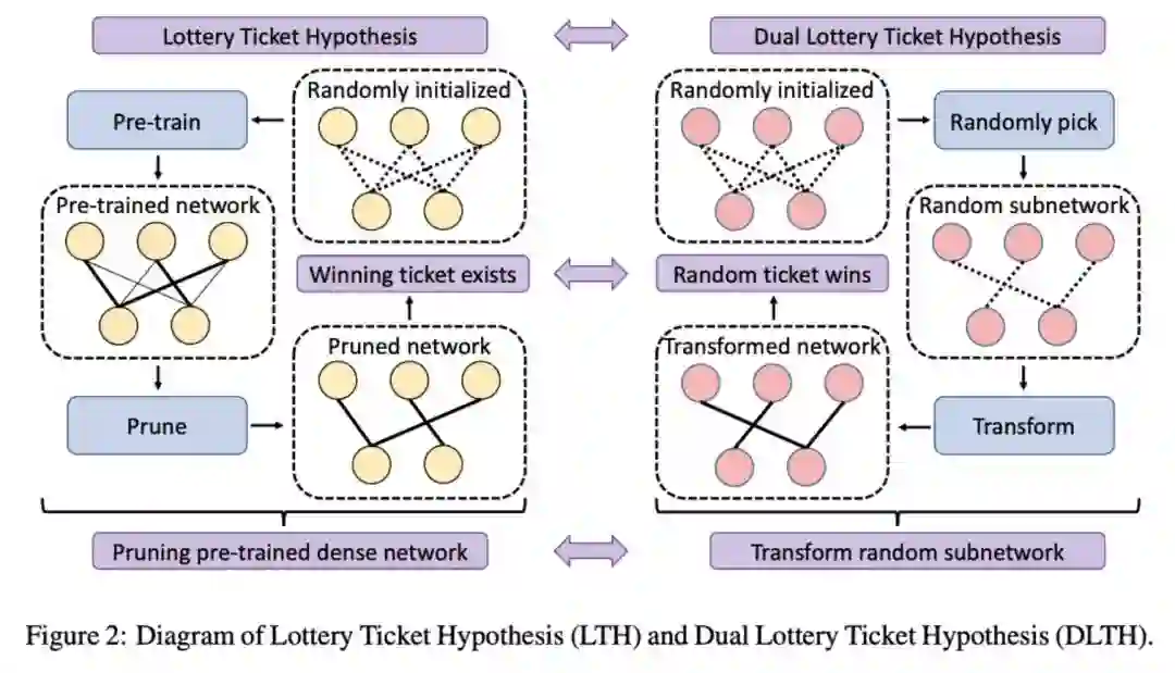 研究者受LTH所启发,探索了其对偶问题并提出对偶彩票假说DLTH:给定随机初始化的网络,其随机挑选的子网络可以被转换成彩票子网络,并得到与LTH找到的彩票子网络相当甚至更好的准确率。