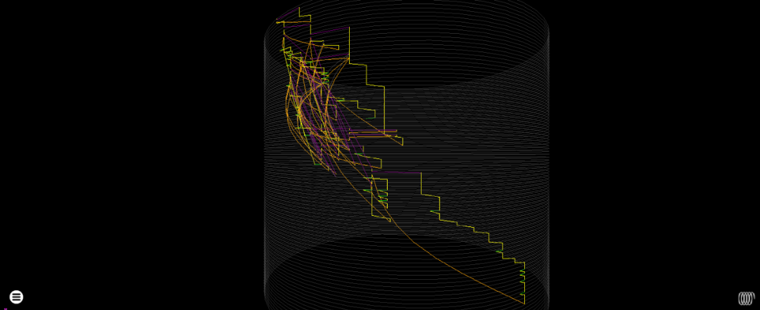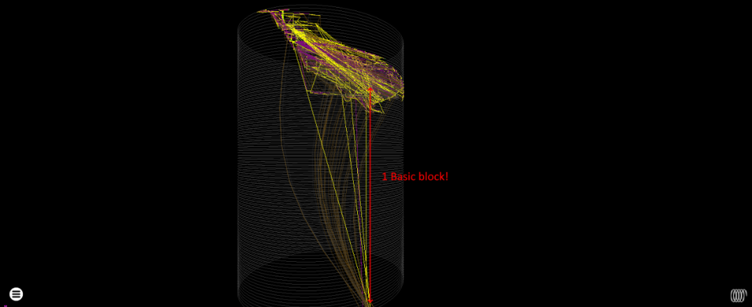 圆柱热图用绿色显示了单次执行(主要是 JIT)的代码,然后是启动解释器后出现的更多循环控制流(所有其他颜色)。