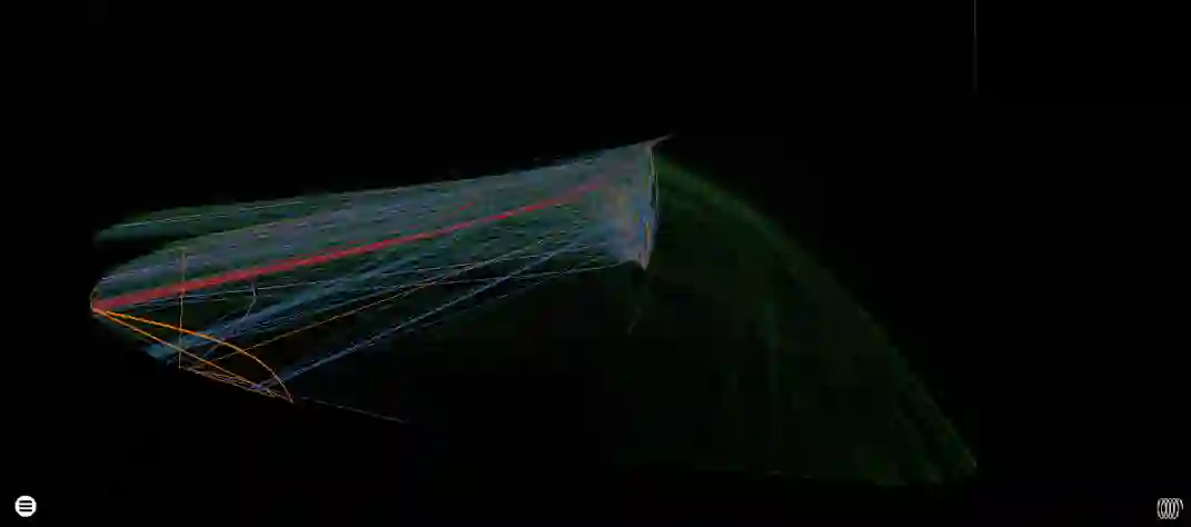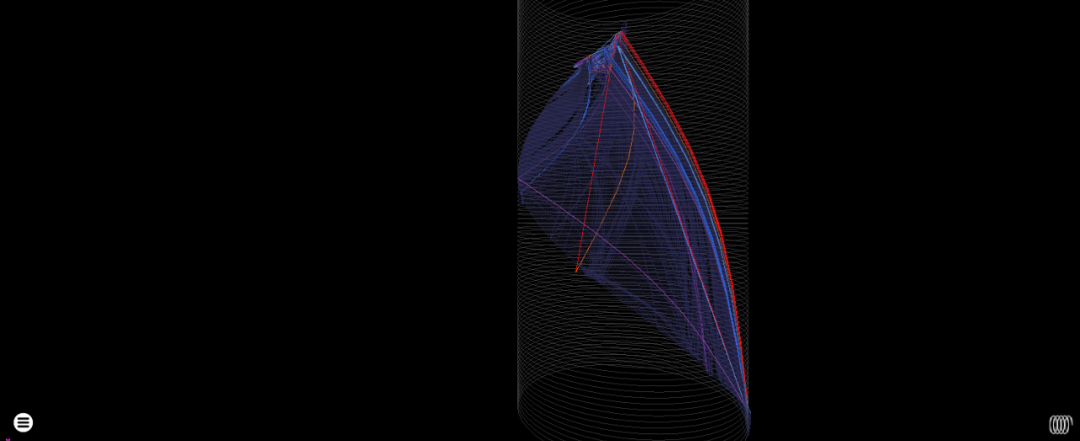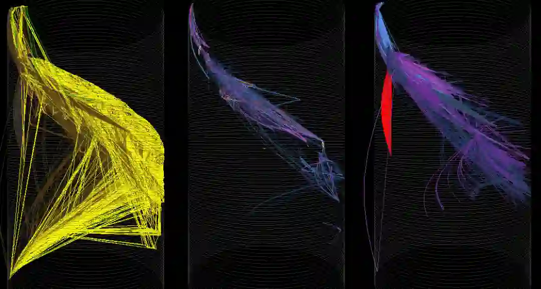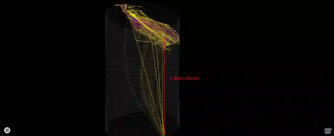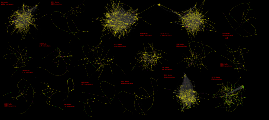 针对15 万个高度连接的节点生成力导向图的标准结果。这些指令总共执行了 2.35 亿多次。为了清晰起见,返回指令对应的边和之前见过的指令对应的边都被淡化了。