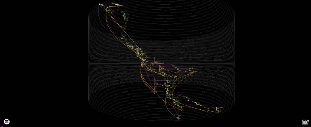 力导向图中的 JIT 代码也有很多这样的泡泡结构,中央调度程序调用了许多微小的代码片段(内部的橙色边是返回指令),你也会看到某些类型的控制流,例如展平。