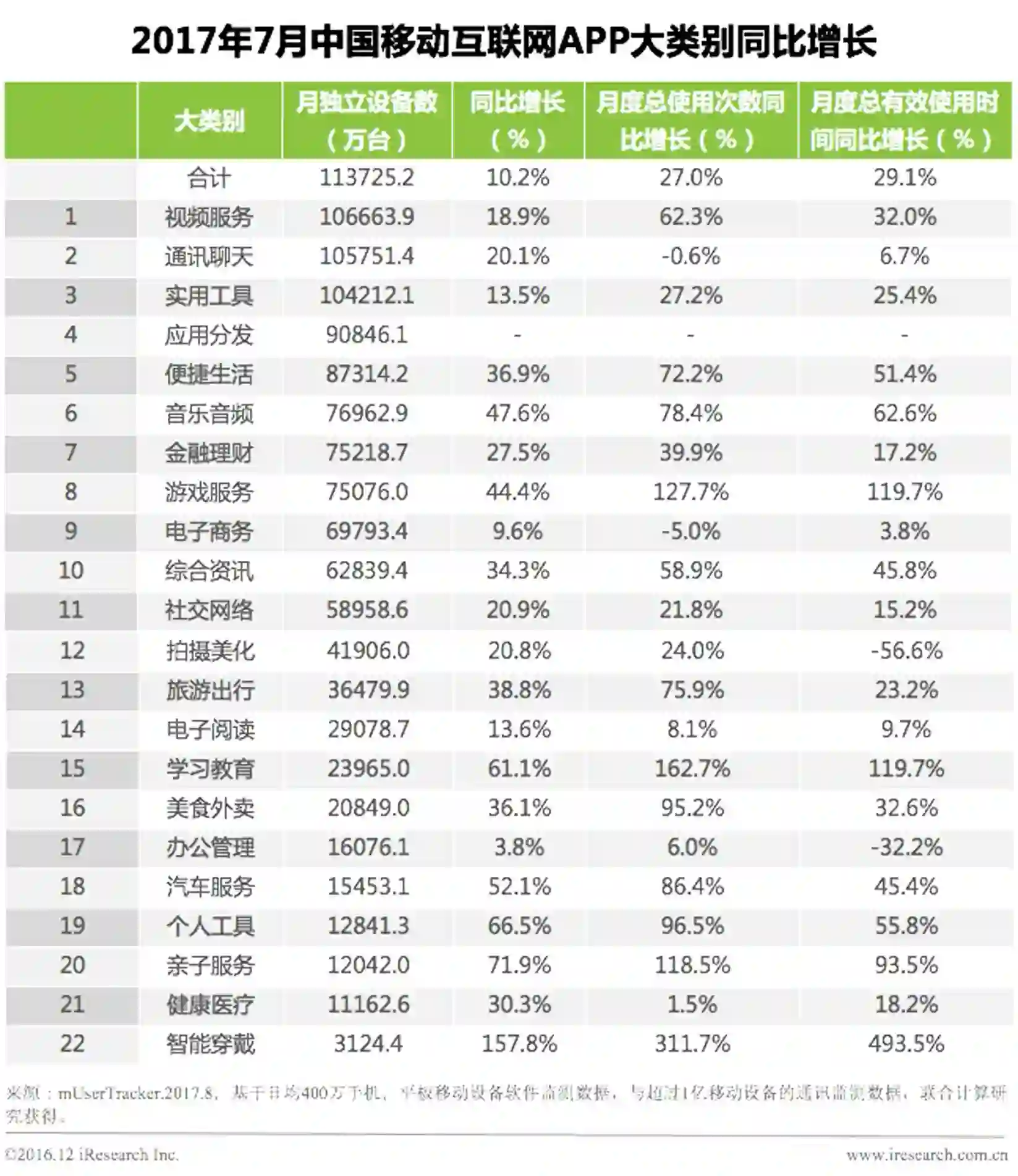综合艾瑞7月APP指数榜单1年内同比增长分析,游戏服务、学习教育、亲子服务和智能穿戴增长最为迅猛,其中游戏服务月度总使用次数同比增长127.7%、月度总有效使用时间同比增长119.7%,学习服务月度总使用次数同比增长162.7%、月度总有效使用时间同比增长119.7%,亲子服务月度总使用次数同比增长118.5%,智能穿戴月独立设备数同比增长157.8%、月度总使用次数同比增长311.7%、月度总有效使用时间同比增长493.5%。