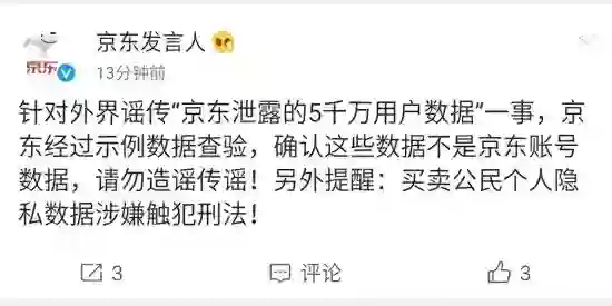 昨日京东官方微博@京东发言人针对外界谣传“京东泄露的5千万用户数据”一事,回应称:这些数据不是京东账号数据,请勿造谣传谣。京东称,经过示例数据查验,确认这些数据不是京东账号数据,另外还提醒:买卖公民个人隐私数据涉嫌触犯刑法。