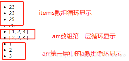 <div id="demo"><ul><li v-for="item in items">{{item}}</li><li v-for="item in arr1">{{item}}</li><li v-for="item in arr1.a">{{item}}</li></ul></div><script>new Vue({el:'#demo',data:{items:[23,23,344,45],arr1:{"a":[1,2,3],"b":[2,2,3]},},methods:{}});</script>