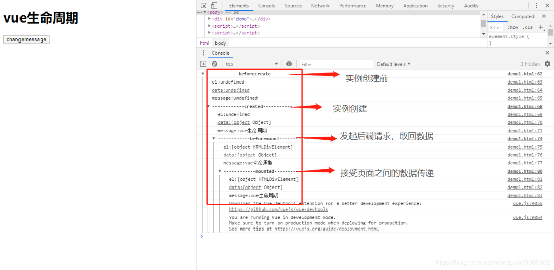 <div id="demo"><h1>{{message}}</h1><button @click="changemessage()">changemessage</button></div><script>var ve =new Vue({el:'#demo',data:{message:'vue生命周期',},beforeCreate:function(){console.group("------------beforecreate-----------")console.log('el:'+this.$el)console.log('data:'+this.$data)console.log('message:'+this.message)},created:function(){console.group("------------created-----------")console.log('el:'+this.$el)console.log('data:'+this.$data)console.log('message:'+this.message)},beforeMount:function(){console.group("------------beforemount-----------")console.log('el:'+this.$el)console.log('data:'+this.$data)console.log('message:'+this.message)},mounted:function(){console.group("------------mounted-----------")console.log('el:'+this.$el)console.log('data:'+this.$data)console.log('message:'+this.message)},beforeUpdate:function(){console.group("------------beforeupdate-----------")console.log('el:'+this.$el)console.log('data:'+this.$data)console.log('message:'+this.message)},updated:function(){console.group("------------updated-----------")console.log('el:'+this.$el)console.log('data:'+this.$data)console.log('message:'+this.message)},beforeDestroy:function(){console.group("------------destotry-----------")console.log('el:'+this.$el)console.log('data:'+this.$data)console.log('message:'+this.message)},destroyed:function(){console.group("------------destroyed-----------")console.log('el:'+this.$el)console.log('data:'+this.$data)console.log('message:'+this.message)},methods:{changemessage:function(){this.message='666'}}});//销毁是在实例外面调用的ve.$destroy()