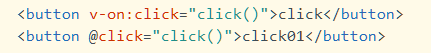 <div id="app">//调用vue中的数据<h1>{{message}}</h1>//下面的两种书写方式结果相同<button v-on:click="click()">click</button><button @click="click()">click01</button></div><script>var ve= new Vue({el:'#app',data:{message:'hello',},methods:{click:function(){alert("你好,世界");}}});</script>