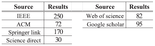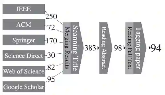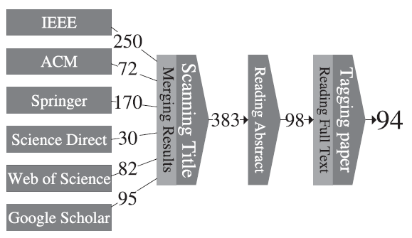 为了收集一类研究,一种高亮伪搜索字符串被用作文献检索系统的搜索关键词,我们选择ACM,IEEE,Springer Link和Science Direct作为文献库,为了查漏补缺,较大的文献库如Web of Science和Google scholar也被搜索过。基于每个搜索源提供的搜索,可以确立包含题目和摘要的搜索集。另外,搜索结果和时间也有关系,覆盖的搜索结果包括2016年以前的文献。