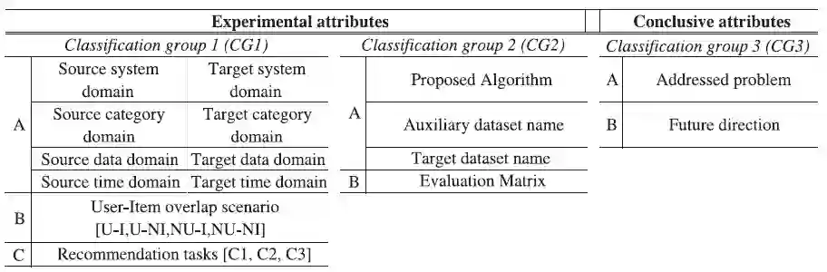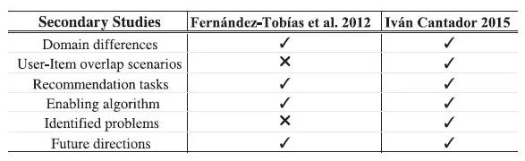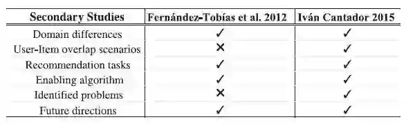 近年来,跨领域推荐系统研究的势头很猛。然而只有两个二级研究吸引了研究的潮流,表1列出了两个二级研究中的共同属性,并根据一级研究进行了分类。