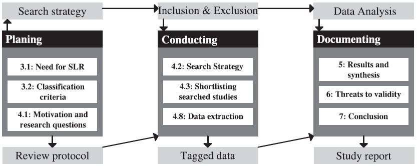 与非结构化的评论过程相比,系统研究综述试图使用详细专业的步骤,按照序列收集相关程度最高的文献。我们根据Brereton的指导,构建3步评审过程,包括准备、实施和记录阶段,图2为每个阶段的具体工作和驱动每个阶段的结果。为了更清楚的说明研究过程,每个阶段的具体工作由实际研究的文献题目表示。