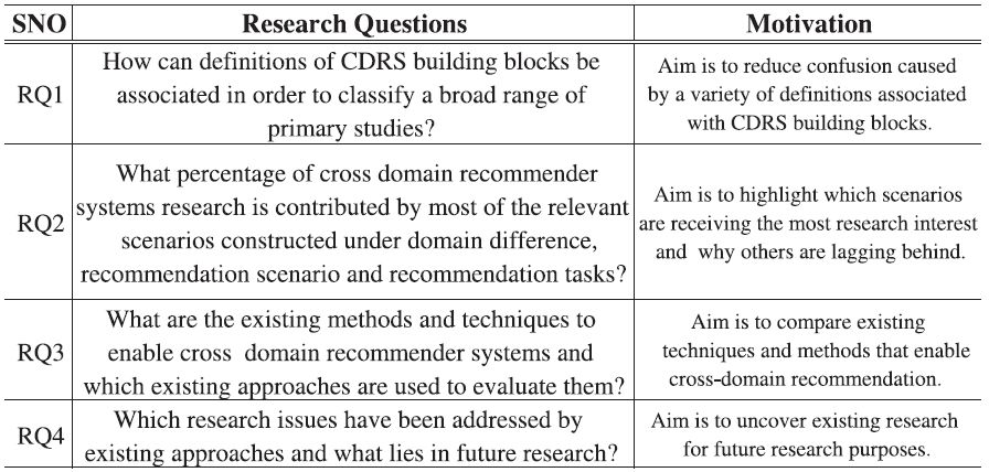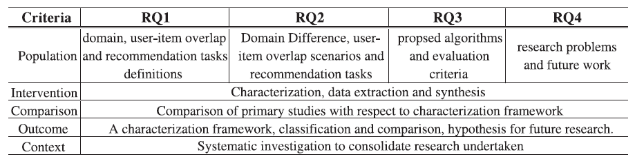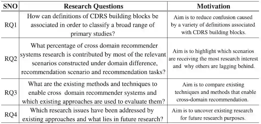 比较2.3中讨论的二级研究,我们决定使用文献综述研究方法,根据领域差异,用户-项目重叠场景,推荐任务,目前存在的问题和未来研究方向分别进行总结。我们的研究动机在3.1中已经定义过了,在本节中,研究问题列在表3中。