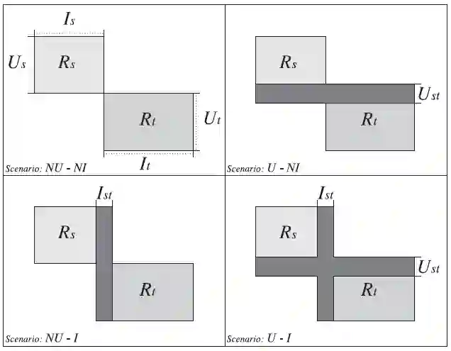 对于用户-项目重叠场景,最突出的贡献是Cremonesi提出的定义,他提出了四种用户-项目重叠场景,这四种方法已经被许多研究者引用过,除此之外还有一些其它的定义方法。