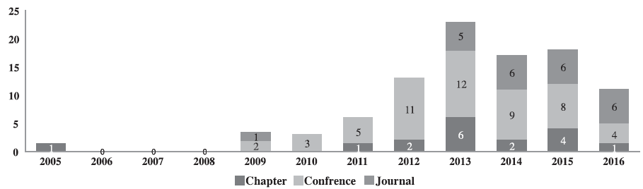 入选的94篇一级研究中,57%是会议出版的,25%是期刊出版的,18%是书籍章节。图5为研究的趋势,最早的研究是2005年的。从2013年开始期刊出版的文献增长迅速,会议文献和书籍章节数量逐渐降低,这一结果和某综述的结论相似。
